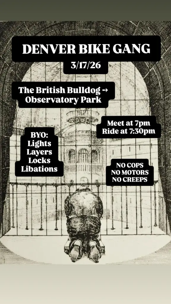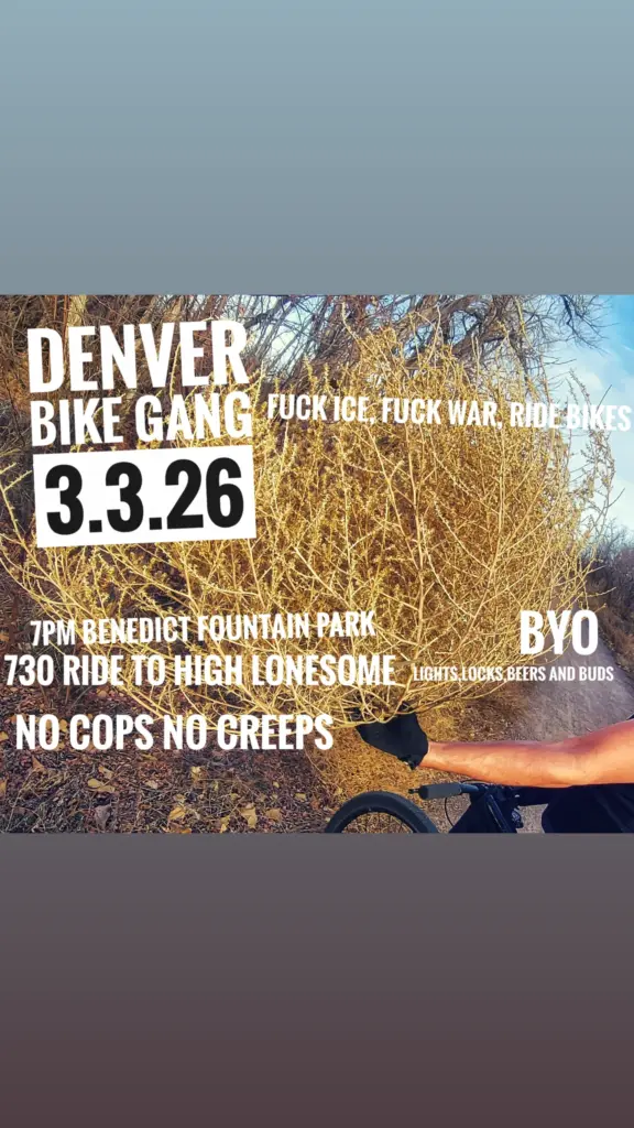 2026.02.24 Warm night=regular ride tonight. Meet at Skylark Lounge (140 S. Broadway), 7 PM. Ride at 7:30, ~11 miles to City Park “Nature Play” space. BYO stuff. No cops motors or creeps. All cats are beautiful and fuck ICE forever <3