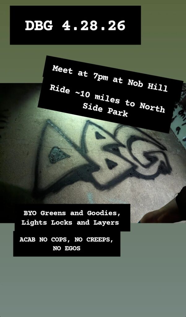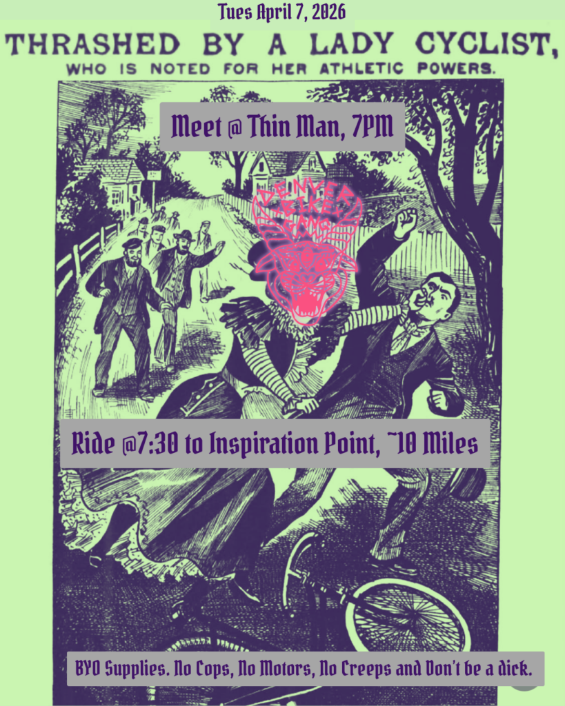 Bring lights, locks, layers, libations. No Cops, No Motors, No Creeps and don’t be a dick. All Cats are Beautiful, in Kwade’s honor we ride.