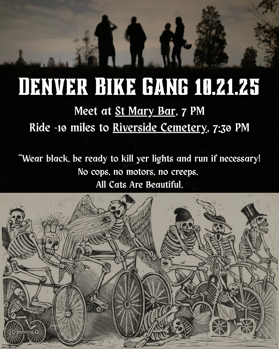 Wear black/dark colors! Tonight we ride to Riverside!