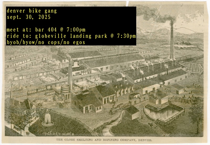 WOW! it’s gonna be nice tonight so we can actually do stuff outside. let’s meet at bar 404 at 7pm and we’ll go ride around the city somewhere before finally ending up at cheeseman park. bring lights, locks. don’t bring cops or attitudes.